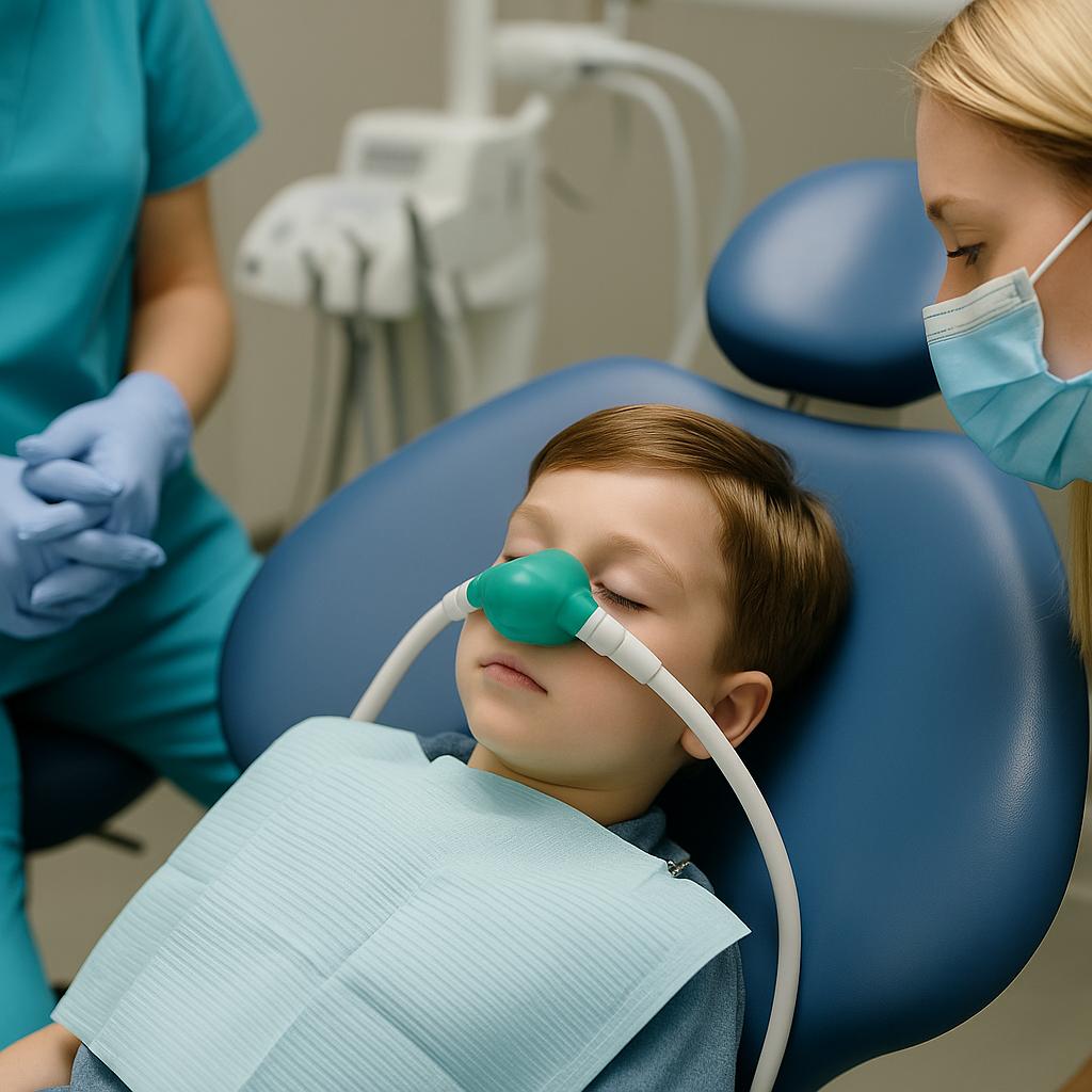 В детской стоматологии чаще всего применяется ингаляционная седация закисью азота — мягким «весёлым газом». Ребёнок дышит через специальную маску смесью кислорода и закиси азота, и уже через несколько минут наступает приятное расслабление, лёгкая сонливость и спокойствие. При этом малыш остаётся в сознании, может дышать самостоятельно и реагировать на речь врача. -