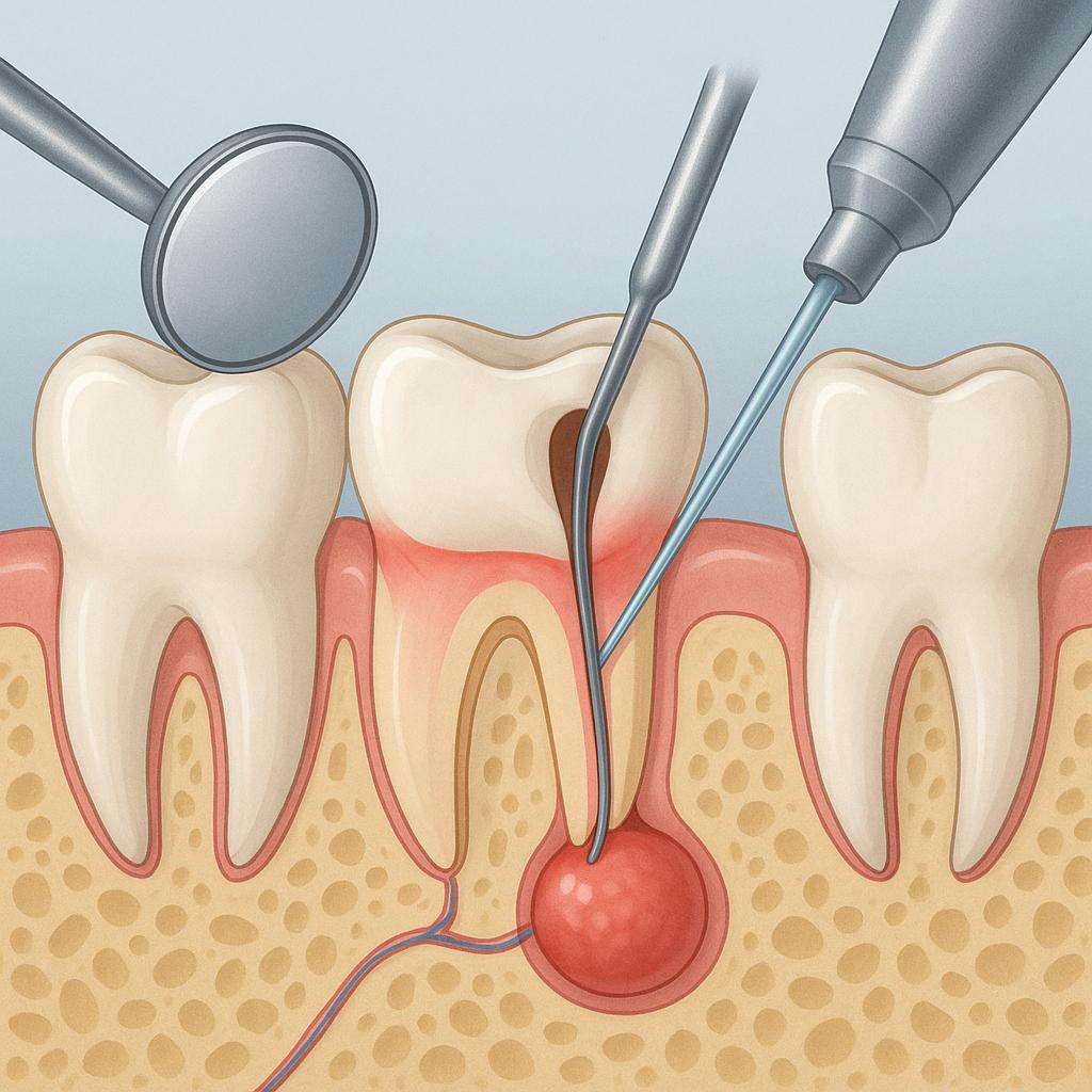 * Резекция верхушки корня (цистэктомия): Это хирургическая процедура, при которой удаляется верхушка корня зуба вместе с кистой. После этого корень пломбируется, а костная ткань восстанавливается. Резекция проводится, если консервативное лечение неэффективно или если каналы зуба недоступны для полноценной обработки.