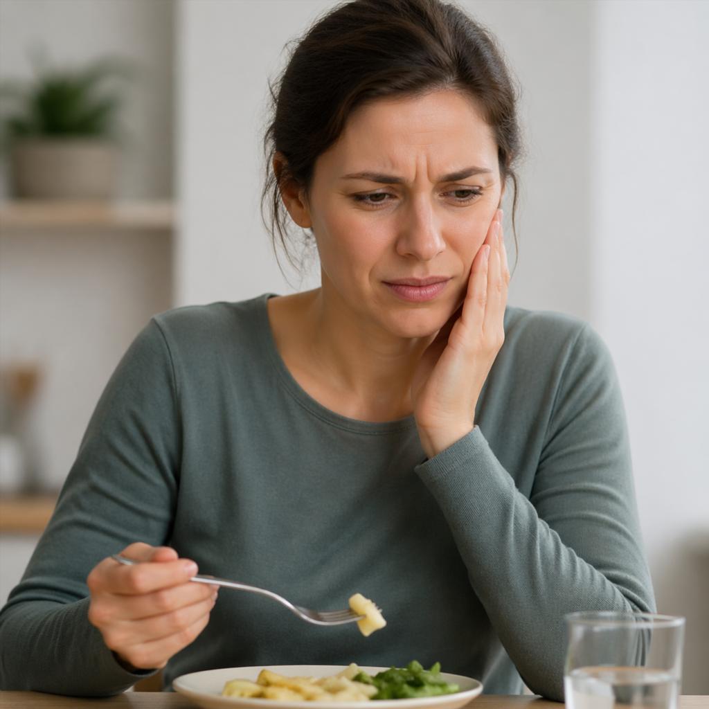 Если разрушение зуба уходит глубже, чем кажется снаружи, во время еды нагрузка начинает раздражать внутренние ткани. На первых этапах это может выглядеть как реакция на сладкое, холодное или плотную пищу. Когда процесс доходит до пульпы, развивается воспаление нерва, и симптомы становятся заметнее. Боль при накусывании в такой ситуации часто сочетается с чувствительностью к температуре, ощущением, что зуб «не такой, как остальные», и дискомфортом, который постепенно усиливается.