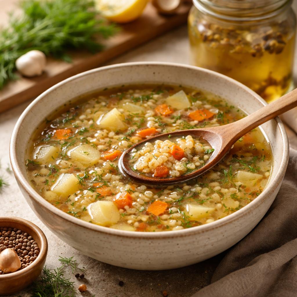Рассол в таком супе начинает работать как фон, а не как акцент. Он поддерживает вкус, но не доминирует. В результате внимание переключается на другие элементы: крупу, корнеплоды, насыщенность бульона. Блюдо перестаёт быть «резким» и чаще воспринимается как тёплое, собранное, стабилизирующее.