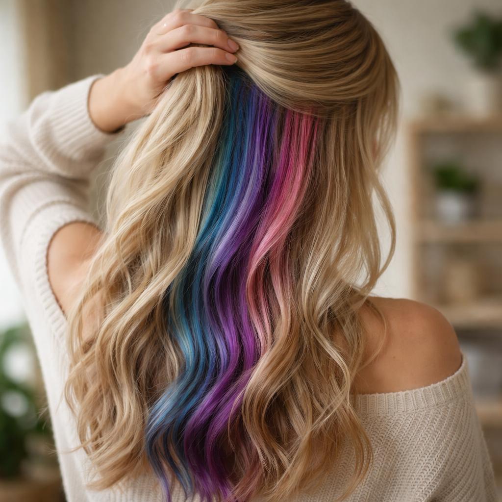 С точки зрения визуального восприятия скрытое окрашивание работает на контрасте. Контраст может быть мягким — близкие оттенки, которые заметны лишь при движении, — или ярким, когда цвет создаёт неожиданный акцент. В обоих случаях важен не сам оттенок, а его взаимодействие с основной массой волос.